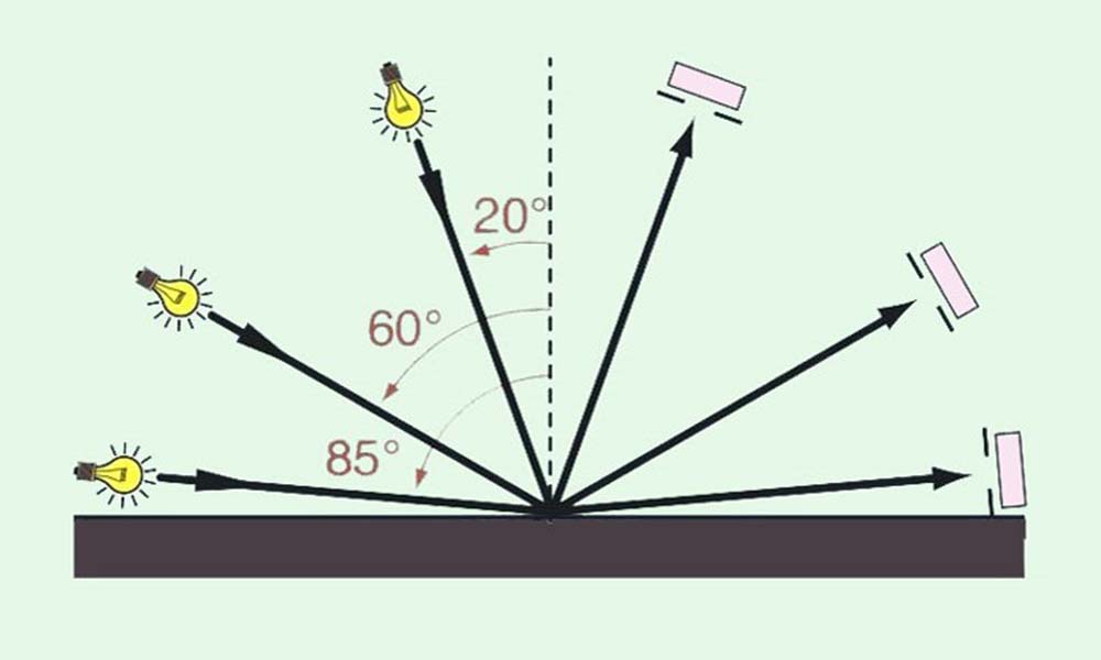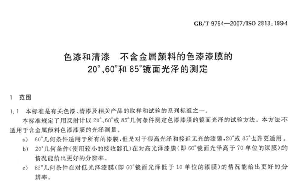 在國家標準GB/T9754-2007中,對于色漆、清漆、不含金屬顏料的色漆漆膜等的光澤度提出了明確的判定方法,以20°、60°或85°幾何條件來測定。20°、60°、85°三個測量角度是指與被測物表面垂直的法線與入射光束的夾角。60°適用于所有漆膜,20°更適合高光澤漆膜,即60°鏡面光澤度高于70單位的漆膜,85°適用于低光澤漆膜,即60°鏡面光澤低于10單位的漆膜。一般而言,可用60°的通用角度測量油漆。