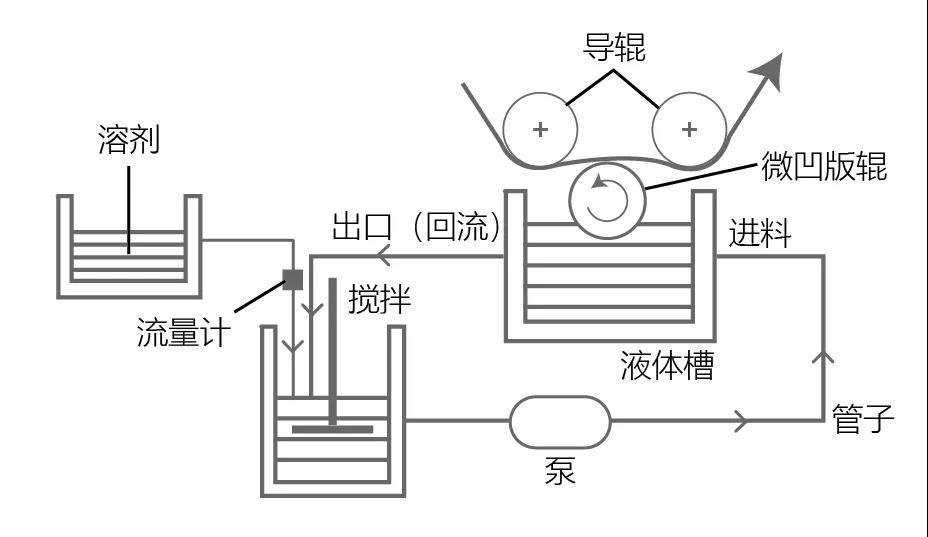 為了解決這個問題,可以在使用微凹的時候,進行回流,使得涂布液處于一個流動的狀態,不容易結皮,同時在回流的時候根據溶劑的揮發速率進行溶劑的補充,從而進一步降低溶劑揮發所帶來的影響。
